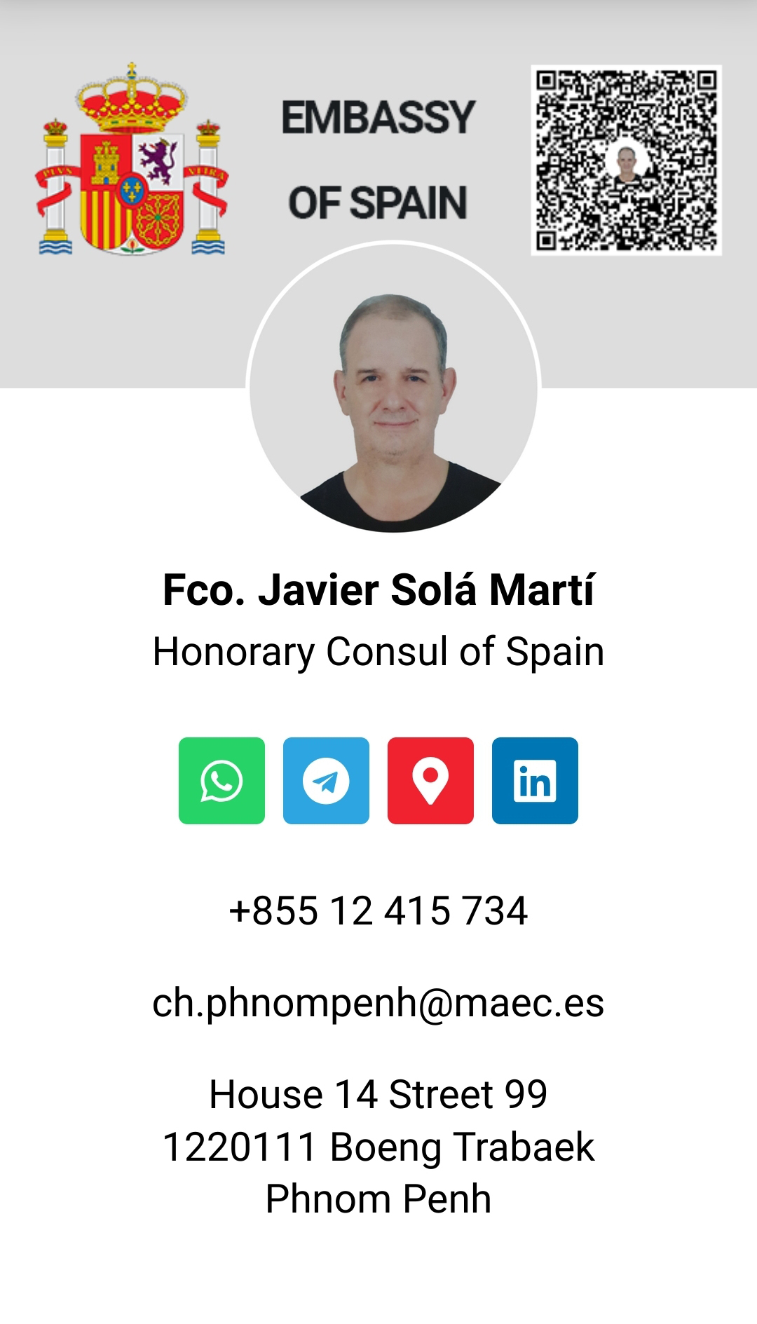 Fco. Javier Solá Martà Honorary Consul of Spain Whatsapp Telegram Map-marker-alt Linkedin +855 12 415 734 ch.phnompenh@maec.es House 14 Street 99 1220111 Boeng Trabaek Phnom Penh Save Contact